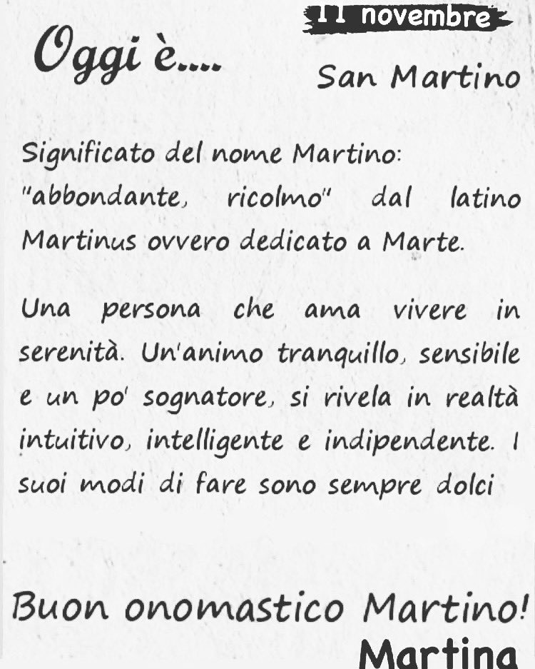 Frasi di auguri originali per whatsapp ed sms, immagini e video per facebook e twitter, curiosità e significato del nome martino.. Frasi di auguri originali per whatsapp ed sms, immagini e video per facebook e twitter, curiosità e significato del nome martino... Auguri di buon onomastico martino, che il tuo santo ti protegga sempre ovunque tu sia.